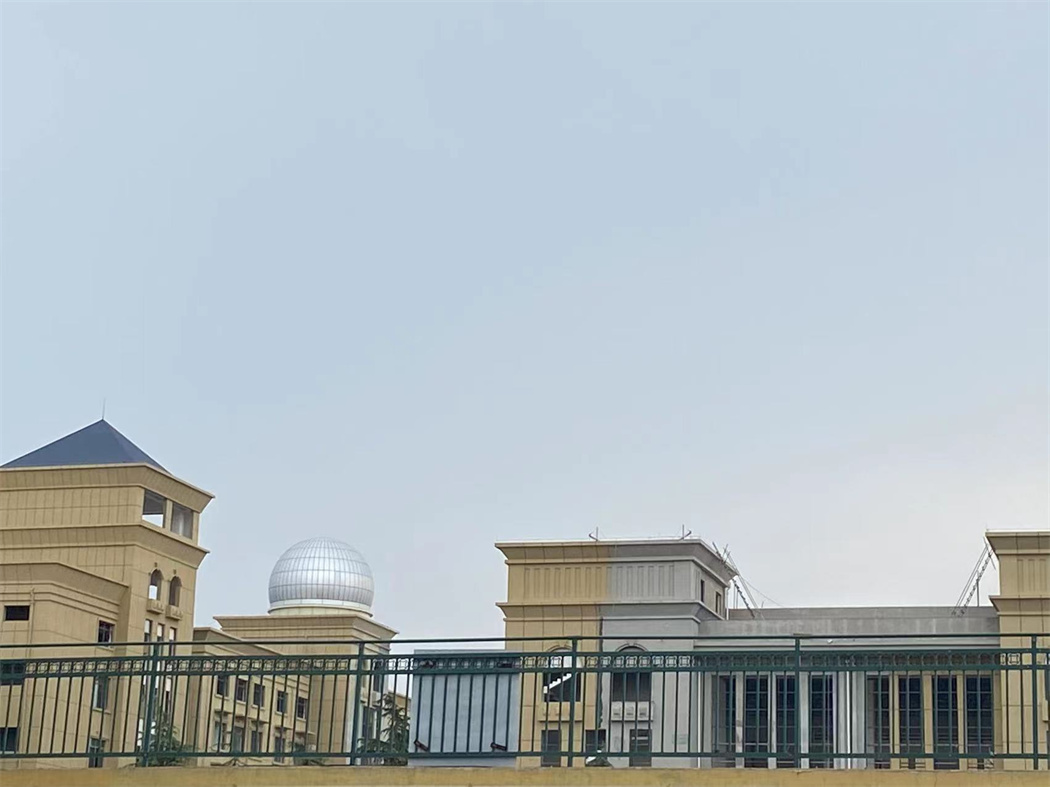淮北中學天文臺,在樓頂搭建一座2.5米高房子,雙層結(jié)構(gòu),外板采用鋁塑板,內(nèi)板采用微孔鋁板,中間有吸音棉,一樓鋪設地磚,二樓鋼結(jié)構(gòu),鋼平臺大梁小梁采用矩形管,定制望遠鏡基座,用于后期放置望遠鏡用,制作順墻弧形鋼梯,扶手采用市場專用扶手,美觀、牢固。上層配備9米經(jīng)典式天文圓頂,外殼光滑,具備抗腐蝕,防銹,密封防塵好,不漏雨,也是天文觀測的標志性建筑,經(jīng)典型天文圓頂古典美麗,是大眾認知度很高的一種天文建筑。