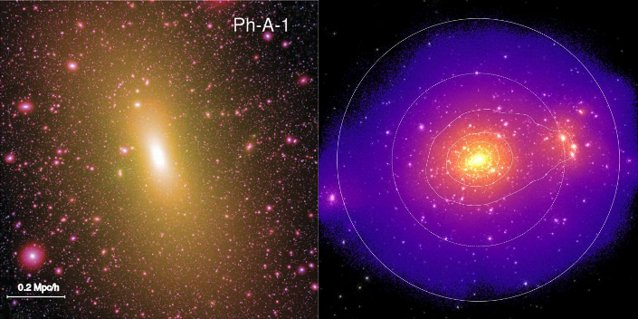 左圖是鳳凰星系團模擬中的一個星系團[2]; 右圖是300星系團項目的中的一個模擬星系團[3]。